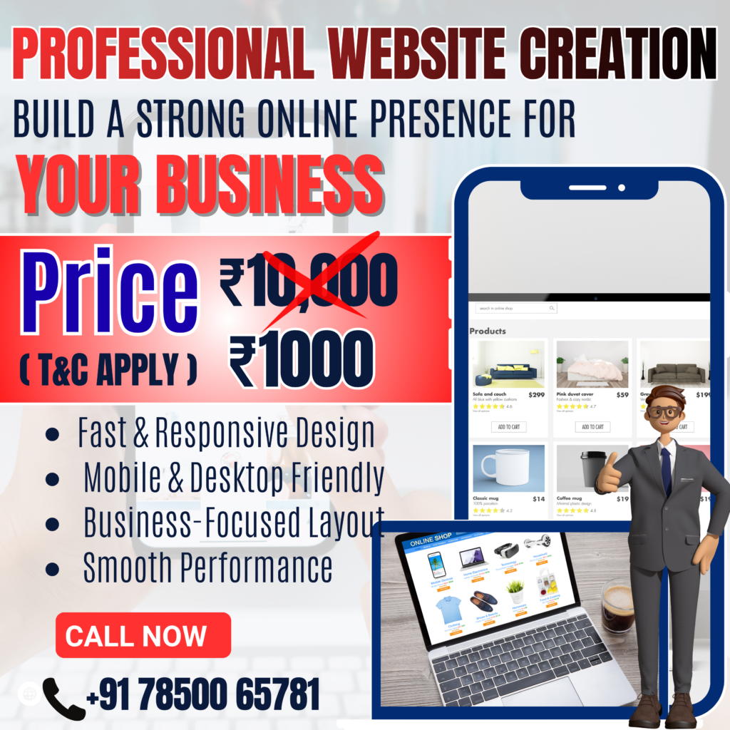 Home Professional Website Creation BuildĀ A Strong Presence For Your Business Price 1000 Rupees Fast & Responsive Design Mobile Friendly Smooth Performance Business- Focused Layout Click here